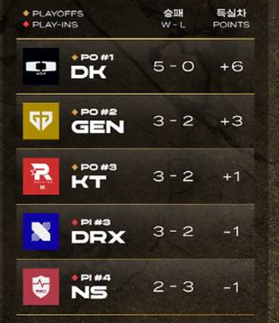 승리한 장로 한 장로팀의 상위 3팀(DK, GEN, KT)은 플레이 오프로 먼저 올라갔습니다.